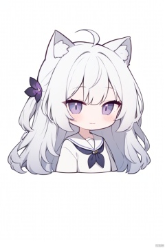 chibi,cleavage, (cat ears), half-closed eyes, school uniform, 1girl, solo, looking at viewer, flower, long hair, bangs, closed mouth, simple background, white background, upper body, white hair, hair intakes, purple eyes, expressionless, eyelashes, best quality, smile, White cat ears<lora:EMS-468386-EMS:0.800000>