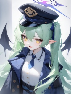 ask (askzy), ultra-detailed,best quality,(masterpiece),highlander-right,1girl,nozomi \(blue archive\),blue archive,hat,long hair,pointy ears,yellow eyes,green hair,twintails,halo,hair between eyes,fang,tail,demon tail,skin fang,very long hair,black headwear,peaked cap