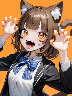 masterpiece,best quality,1girl,solo,animal ears,bow,teeth,jacket,tail,open mouth,brown hair,orange background,bowtie,orange nails,simple background,cat ears,orange eyes,blue bow,animal ear fluff,cat tail,looking at viewer,upper body,shirt,school uniform,hood,striped bow,striped,white shirt,black jacket,blue bowtie,fingernails,long sleeves,cat girl,bangs,fangs,collared shirt,striped bowtie,short hair,tongue,hoodie,sharp teeth,facial mark,claw pose,