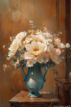 Close up, vase on the living room table, front composition, wallpaper, high resolution, oil painting style,
