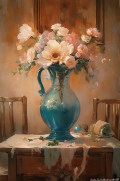 Close up, vase on restaurant table, front composition, wallpaper, high resolution, oil painting style,