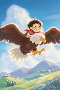A majestic bald eagle soars through a clear blue sky, its powerful wings outstretched as a tiny boy with a curious grin clings to its feathers, his small hands grasping firmly onto the eagle's back as it glides effortlessly above a serene landscape of rolling hills and fluffy white clouds.