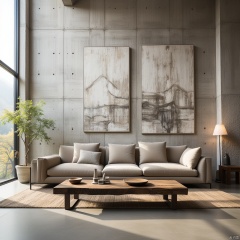 A modern living room with a cozy sofa and a low coffee table,abstract art paintings hanging on the wall,minimalist decor in whites and greys,natural light pouring through floor-to-ceiling windows,high-quality picture of a contemporary interior design,sharp focus,detailed textures.,fangzi