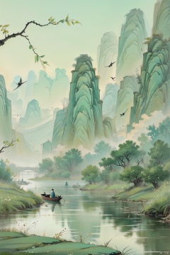 On the misty lake, small boats and tender green trees grow along the shore. A pair of swallows fly among the young willow branches, creating a calm and hopeful atmosphere, heralding the awakening of nature and ink painting. Chinese ink painting