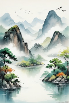charming country house, blue siding, situated, side, road, surrounded, lush green grass, trees, background, creating, idyllic countryside setting, small fence, seen near, rustic charm, main house, two smaller houses visible, further down, road, one closer, left edge, scene, another towards, right, homes contribute, overall picturesque landscape, rural area,Exquisite style painting, Chinese ink landscape painting