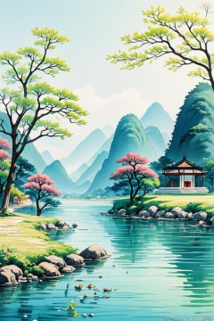 Chinese classical architecture, red crowned crane, overlooking mountains from afar, high-rise building, (white background: 1.1), ink painting, foreground of osmanthus tree, distant lake, riverbank with some rockeries and stones, red maple trees, and small boats on the river surface