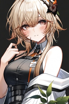 quality,best,1girl, bangs, bare_shoulders, black_flower, blush, breasts, eyebrows_visible_through_hair, flower, hair_between_eyes, hair_flower, holding, large_breasts, leaf, looking_at_viewer, plant, rose, solo, upper_body, weapon, white_flower, white_rose,vendela_\(arknights\)