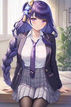 score_9,score_8_up,score_7_up,score_6_up,source_anime,source_cartoon,<lora:raiden shougunTuPONYXL-000001:0.8>,raiden shogun,1girl,solo,skirt,pantyhose,purple eyes,long hair,necktie,purple hair,braid,looking at viewer,shirt,purple necktie,jacket,breasts,school uniform,white shirt,long sleeves,collared shirt,black pantyhose,plaid skirt,blush,hair ornament,open clothes,pleated skirt,black jacket,indoors,braided ponytail,grey skirt,open jacket,very long hair,blazer,collarbone,large breasts,blunt bangs,plaid,:o,cleavage,