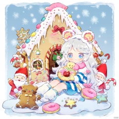 可爱水彩插画头像_烟上月,这幅图描绘了一个奇幻的场景,中心是一个年轻女孩,背景是一个中式风格的建筑。她有着长长的白色头发,头上戴着粉色蝴蝶结。她的眼睛大而圆,睫毛浓密,给人一种俏皮的感觉。她穿着一条蓝白条纹的裙子,配以浅蓝色短袜和白色鞋子。 她坐在一个巨大的姜饼屋旁,这个屋子是用糖霜装饰的,有着各种装饰物,比如雪花、星星,以及看起来像糖果的物品。这个屋子还有一个窗户和门,门上挂着一个小红色圣诞帽,暗示着节日主题。 在姜饼屋周围,有两个类似圣诞老人的形象,一个在左边,一个在右边,都带着红色帽子。女孩手里拿着一个心形的糖果,旁边放着一个粉色甜甜圈。整体氛围温暖而欢乐,背景是柔和的蓝色和白色,增加了冬季节日的感觉。
