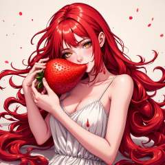 high quality manga illustration of a beautiful mkm4 evil woman messily eating a giant strawberry, the woman has very long and red hair and is wearing a sundress, she is biting into the strawberry and strawberry juice is running down her face and stains her clothes, the strawberry is larger than the woman's head, <lora:mkm4-000008:1>