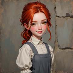 portrait of cute mkm4 girl in a gray dress smiling ,in style of Vincent van Gogh, oil painting. She is standing in front of a stone wall, outdoor, and her red hair is styled in an elegant updo. Her makeup is subtle and natural, and she has a warm and inviting expression on her face, <lora:mkm4-000008:1>