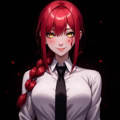 anime of mkm4 woman, best quality, ultra detailed, solo, standing, red hair, long braided hair, blood on the face, golden eyes, bangs, medium breasts, white shirt, necktie, stare, smile, (evil:1.2), looking at viewer, dark background, chains <lora:mkm4-000008:1>