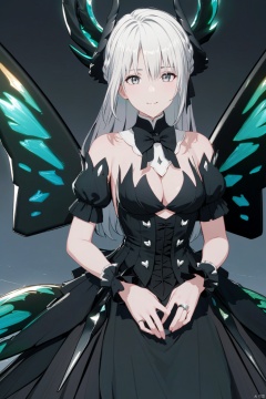 masterpiece,best quality,wallpaper,depth of field,high contrast,1girl,long hair,white hair,grey eyes,smile, bangs, dress, bow, cleavage, bare shoulders, medium breasts, white hair, short sleeves, detached sleeves, wings, horns, puffy sleeves, bowtie, black dress, puffy short sleeves, wrist cuffs, grey eyes, black bow, detached collar,ring,cowboy shot,outdoors,blue sky,from above