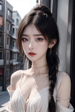 1girl, artist name, bare shoulders, blue eyes, blue hair, blurry, blurry background, braid, breasts, building, choker, cleavage, depth of field, earrings, hair over shoulder, jewelry, long hair, looking at viewer, medium breasts, necklace, off shoulder, outdoors, parted lips, single braid, solo, sunset, upper body  <lora:1:1>