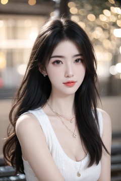1girl, black hair, blurry, blurry background, bokeh, depth of field, jewelry, lens flare, lips, long hair, looking at viewer, necklace, outdoors, sleeveless, solo <lora:美女:1>