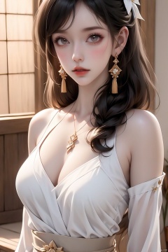 1girl, solo, long hair, breasts, looking at viewer, bangs, black hair, hair ornament, long sleeves, dress, cleavage, bare shoulders, jewelry, medium breasts, upper body, flower, earrings, parted lips, indoors, hair flower, white dress, grey eyes, sash, tassel