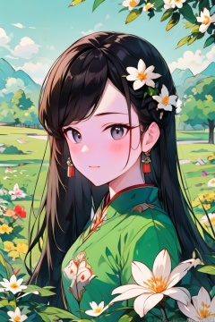 1girl, solo, long hair, breasts, looking at viewer, blush, bangs, blue eyes, black hair, hair ornament, long sleeves, dress, jewelry, upper body, flower, earrings, outdoors, parted lips, sky, day, cloud, hair flower, tree, parted bangs, watermark, chinese clothes, floral print, white flower, tassel, green dress, mountain