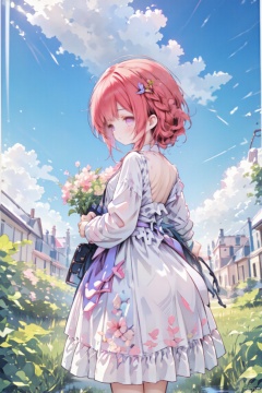 upper body,Create an image of an anime girl with bright red hair,wearing a sundress and holding a bouquet of wildflowers,standing in a field of tall grass with a soft breeze blowing through. The scene should capture the whimsical and carefree style of Sakimichan,with a sense of peace and tranquility in the air.