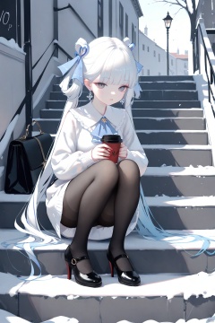 1girl, solo, long hair, breasts, looking at viewer, bangs,long sleeves, dress, bow, ribbon, holding, twintails, jewelry, very long hair, full body, hair ribbon, white hair, pantyhose, earrings, parted lips, shoes, belt, grey background, bag, black footwear, white dress, high heels, sweater, cup, grey eyes, black pantyhose, ascot, squatting, steam, holding cup, hair rings, thighband pantyhose, white sweater, disposable cup, coffee cup,(masterpiece), (best quality), illustration, ultra detailed, hdr, Depth of field, (colorful),loli,[Artist:wlop],[[Artist:sheya]],Artist:ask \(askzy\),stairs,outdoors,shopping bag,