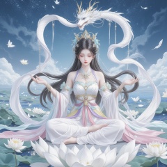 Chinese mature woman,Sitting cross-legged on a white lotus throne and a golden hat above his head,in anime style appearance,White Hanfu,golden crown,eyes closed,1girl,jewelry,long hair,hands out of hydrangea,hands tighhighs,see see Holding,see body,lovely little princess,dragon lady,with a pair of dragon horns ((masterpiece,best quality))) on her head,((good structure, good composition,good glowing translucent), Translucent of women),tiny golden accents,beautifully and intricately detailed,ethereal glow,whimsical,art by Mschiffer blue theme,off original,view (beautiful),transparent,shiny_clothes,pink chest pleated skirt,white with yellow pibo,pink pibo,qingsha,dunhuang((water drops)),wet clothes,((beautiful detailed water)),((floating)),dynamic angle,((Beautiful butterflies in detail)),((Beautiful stars in detail)),(((halter dress ))),particle,(Starry sky in beautiful detail),(Hazy fog),(Ruins of beautiful details),(((Standing on the surface of the sea))),yellow waistband,purple with white waistband,light green waistband, <lora:风月无边illustrations_v1.0:0.51> <lora:FLUX-汉服人像艺术-国风-氛围感-liangyi_尝鲜版:0.41> <lora:kingheretynjfl:0.41> <lora:flux_gf_v4.0:0.5> <lora:flux-test-lora:0.5> <lora:FLUX1-超写实逼真黑悟空-支持在线生图_FLUX-超写实黑悟空--V1:0.51> <lora:dunhuang:0.51>