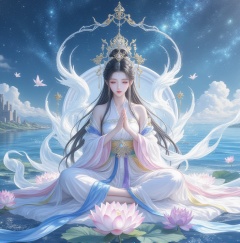 Chinese mature woman,Sitting cross-legged on a white lotus throne and a golden hat above his head,in anime style appearance,White Hanfu,golden crown,eyes closed,1girl,jewelry,long hair,hands out of hydrangea,hands tighhighs,see see Holding,see body,lovely little princess,dragon lady,with a pair of dragon horns ((masterpiece,best quality))) on her head,((good structure, good composition,good glowing translucent), Translucent of women),tiny golden accents,beautifully and intricately detailed,ethereal glow,whimsical,art by Mschiffer blue theme,off original,view (beautiful),transparent,shiny_clothes,pink chest pleated skirt,white with yellow pibo,pink pibo,((water drops)),wet clothes,((beautiful detailed water)),((floating)),dynamic angle,((Beautiful butterflies in detail)),((Beautiful stars in detail)),(((halter dress ))),particle,(Starry sky in beautiful detail),(Hazy fog),(Ruins of beautiful details),(((Standing on the surface of the sea))),yellow waistband,purple with white waistband,light green waistband, <lora:风月无边illustrations_v1.0:0.51> <lora:FLUX-汉服人像艺术-国风-氛围感-liangyi_尝鲜版:0.41> <lora:kingheretynjfl:0.41> <lora:flux_gf_v4.0:0.5> <lora:flux-test-lora:0.5>