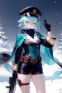 1girl, sinon, gun, solo, weapon, white scarf, hat, holding weapon, looking at viewer, holding gun, hair ornament, bangs, gloves, smile, long sleeves, hair between eyes, white gloves, scarf, military, black shorts, holding, anti-materiel rifle, black headwear, belt, hairclip, breasts, rifle, snowing, black jacket, short hair, aqua hair, black cape, jacket, cowboy shot, hand up, military uniform, slit pupils, light particles, shorts, white belt, aqua eyes, thigh strap, arm up, sidelocks, closed mouth, blush, sniper rifle, medium breasts, cape, double-breasted, buttons, energy, magic, outdoors, glowing, standing, short shorts, uniform, thighs