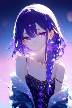 masterpiece,best quality,high quality,(colorful),loli,1girl,solo,long hair,looking at viewer,upper body,head tilt,blue theme,jacket,closed mouth,earrings,bare shoulders,off shoulder,jewelry,strap slip,collarbone,camisole,blue background,backlighting,pink background,multicolored hair,gradient background,simple background,hair between eyes,expressionless,spaghetti strap,blue jacket,shirt,sidelocks,glowing,Blur,float light, braid, mole, braided_ponytail, single_braid,purple hair,purple eyes,