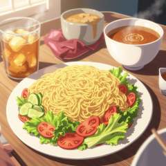 anime art in the sh1nk style, close-up of a table with a plate of noodles and a bowl of soup on it. The plate is filled with a variety of vegetables, including lettuce, tomatoes, and cucumbers, and the soup is steaming hot. On the left side of the table, there is a glass of iced tea with ice cubes in it, and on the right side, there are a few other objects. The image is animated, giving it a lively and vibrant feel. <lora:sh1nk:1>