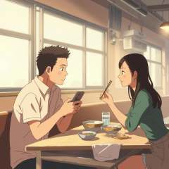 anime art in the sh1nk style, a man and woman sitting at a table in a restaurant. The man is holding a mobile phone in his hand and the woman is holding chopsticks in her hand. On the table in front of them are two bowls of food and a glass of water. In the background, there is a wall with windows and a fan attached to the ceiling, <lora:sh1nk:1>
