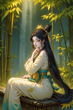 A serene Chinese beauty sits on a intricately carved wooden stool, surrounded by lush greenery in a traditional garden setting. Soft, golden light filters through the bamboo shoots, illuminating her delicate features and long black hair that cascades down her back like a waterfall. Her eyes gaze softly into the distance, a hint of melancholy on her porcelain-doll complexion.
