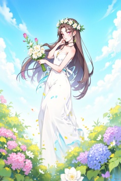 杰作,1girl, blue_flower, blue_sky, bouquet, breasts, brown_hair, closed_mouth, cloud, daisy, day, dress, field, flower, flower_field, grass, head_wreath, holding_bouquet, holding_flower, hydrangea, laurel_crown, lily_\(flower\), long_hair, looking_at_viewer, outdoors, petals, pink_flower, plant, purple_eyes, purple_flower, rose, sky, smile, solo, standing, sword, very_long_hair, white_dress, white_flower, white_rose, wreath