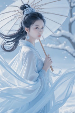 1girl, umbrella, solo, black hair, hair ornament, holding umbrella, holding, flower, jewelry, long hair, earrings, chinese clothes, dress, long sleeves, hair flower, blue eyes, upper body, hanfu, white dress, hair bun, snow, mole under eye, wide sleeves, snowing, oil-paper umbrella, from side, tree, facial mark, branch