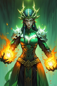 Soul Destroyer, God Hela, a female cyborg as God Hela wearing futuristic armor holding glowing orange fire balls in her hands, light green color tone, highly detailed, ultra-high resolutions, 32K UHD, best quality, masterpiece,kongkong