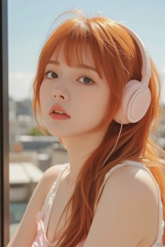 fashion portrait,Close-up portrait a asian woman with red hair wearing headphones in front of a window, inspired by Oleg Oprisco, trending on pexels, toned orange and pastel pink, mary jane ansell, bright sunny day, in a rooftop, hugh kretschmer, curl noise