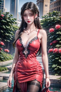 8K image., shinkai color,, ((poakl)),1girl, solo, long hair, breasts, looking at viewer, black hair, dress, holding, bare shoulders, jewelry, medium breasts, standing, flower, pantyhose, cowboy shot, earrings, parted lips, sleeveless, necklace, lips, grey eyes, black pantyhose, sleeveless dress, rose, red dress, red flower, red rose, red lips