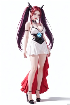 Realistic style, cinematic work, 8K wallpaper, masterpiece, very realistic quality, best quality, masterpiece, high-level, high-resolution, , , Edge lighting, dual tone lighting, soft lighting, The illuminated surface of the material has bright spots and highlights, which flicker and have a mirror effect when reflected, There are sparkling spots on the armor, , , 1 girl, mature female, solo, full body, looking at viewer, lace, strong rim light, Standard proportion of female body, golden proportion of female body, , , Standing, standing posture, Sexy full body standing posture, , , , (jialimaoxian, breasts, barefoot, smile, toenails, large breasts, fingernails, cleavage, sharp fingernails, long hair, purple hair, red eyes, twintails, (red head wings:1.5), bangs, large breasts, fingernails, parted bangs, very long hair, cleavage, sharp fingernails, , bare shoulders, off shoulder, black hairband, bikini bottom only, short dress, swimsuit, pleated dress, bikini, floating hair, blush, ass visible through thighs, skirt, White high-heeled shoes, :1.2), , , colorful, (detailed skin: 1.3, detailed face: 1.3), clear focus, delicate, (mature women: 1.2), (glossy skin+glossy skin: 1.4), (sweating: 1.1), (big_eyes), red_ eyeshadow, long_ Eyelashes, red lips, , , simple background, grey background, , , (Diamond hair accessories, diamond necklaces, diamond earrings, diamond earrings, clothes embedded with diamonds, armor embedded with diamonds, :1.3), , feilikesishuerci, 1girl, jinluhao, jialimaoxian,<lora:EMS-73698-EMS:0.400000>,<lora:EMS-79531-EMS:0.200000>