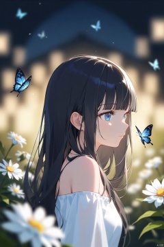 1girl, solo, long hair, flower, blurry, bug, butterfly, blue eyes, white flower, bare shoulders, blurry background, upper body, black hair, depth of field, off shoulder, closed mouth, dress, shirt, blunt bangs