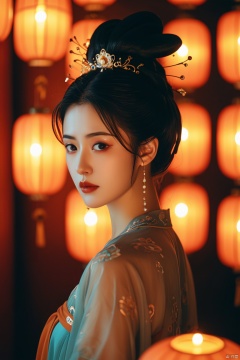 表情落寞的古风美女,心事重重,黑色的眼眸,灯笼下隐隐绰绰的烛光,silhouette of Woman, backlit with orange light, random geometry & shapes in the background, blur, bulb photography, film, color negative,新中式,颜色曲线,精美的唐朝华丽服饰,高速动态模糊