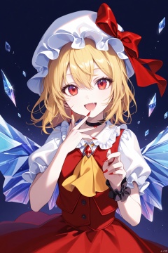 1girl, solo, mob cap, hat, flandre scarlet, red nails, blonde hair, red eyes, yellow ascot, skirt, vest, ascot, red skirt, white headwear, nail polish, shirt, red vest, looking at viewer, fingernails, frills, short sleeves, open mouth, white shirt, choker, crystal, ribbon, smile, wrist cuffs, sharp fingernails, hat ribbon, red ribbon, hair between eyes, puffy short sleeves, puffy sleeves, frilled shirt collar, wings