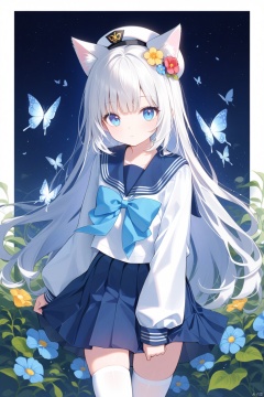 1girl, solo, skirt, thighhighs, blue_eyes, butterfly, animal_ears, sailor_collar, white_thighhighs, hat, hair_ornament, bug, white_hair, blue_skirt, flower, pleated_skirt, long_hair, school_uniform, long_sleeves, hair_flower, wings, blue_sailor_collar, serafuku, looking_at_viewer, closed_mouth, bow, shirt