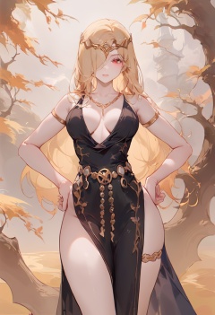 1girl,ciloranko, maccha \(mochancc\), lobelia \(saclia\), migolu, ask \(askzy\), wanke, (jiu ye sang:1.1), (rumoon:0.9), (mizumi zumi:1.1),gold necklace, blonde hair, red eyes, gold chain accessories on legs, gold chain belt, black dress with gold details, gold armlets, gold crown, deep v-neckline, hair over one eye, hand on own hip, cleavage, looking at viewer, circlet, large breasts, side slit, closed mouth, standing, one eye covered, thighs, tree, lips, cowboy shot,masterpiece, best quality,newest, absurdres, sensitive <lora:Elden Ring-Marika_v1.0:1>