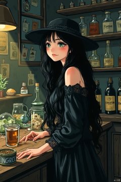 ANIME GIRL, Set in a dimly lit, cluttered potion shop filled with strange ingredients, a girl with long raven-black hair and deep green eyes studies her concoctions. Clad in a dark flowing dress with lace details, she wears a wide-brimmed hat, her sly smile hinting at her vast knowledge of the arcane arts,ink drawing