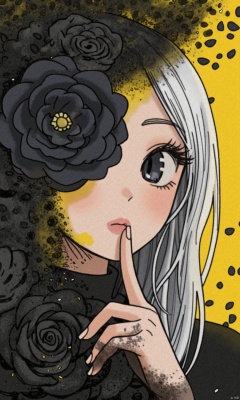 This acrylic style painting is extremely expressive and presents a dynamic and emotional quality. This is a piece of anime art that depicts a stylized portrait of a woman with an ethereal black and yellow mist surrounding her body. The mist creates a dramatic and surreal effect. A blooming black flower covers one eye on the face. White hair sets off the woman's cold beauty. The woman in the anime artwork is shrouded in shadows and the lighting accentuates her unique features. The background is yellow and black and covered with black rose petals. Fingers are placed on lips in a shhh, shhh motion,