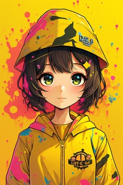 japanese cool anime,1girl, Colorful pop art, yellow honey candy pop, lollipop punk, brightly colored honey candy, emo yelow lolita girl, Beautiful Eyes, Yellow hood with bee logo, maximalism designemo, dal-6 style, Color Splash,niji