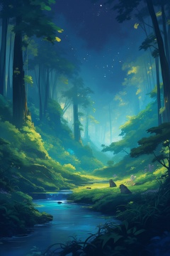 Viral anime nature wallpaper in 4K quality, in the style of digital illustration inspired by Hayao Miyazaki, featuring a serene forest with towering ancient trees, dappled sunlight filtering through the leaves, a gentle stream flowing through the scene, and mystical creatures peeking from behind the foliage; vibrant and warm color temperature, cosmos lighting with stars twinkling in the sky, no human characters, the atmosphere is tranquil and enchanting --v 5 --stylize 1000