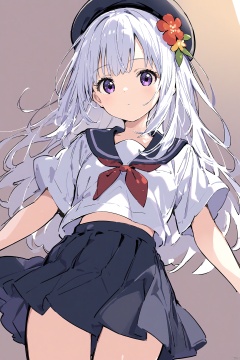 1girl, solo, long hair, school uniform, hat, purple eyes, flower, tomoeda elementary school uniform, skirt, serafuku, hair flower, hair ornament, white hair, beret, pleated skirt, sketch, looking at viewer