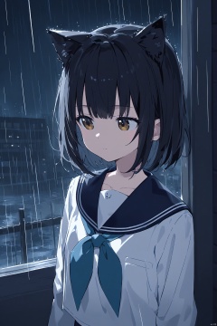 animal_ears, 1girl, black_hair, sailor_collar, solo, short_hair, cat_ears, school_uniform, serafuku, black_sailor_collar, upper_body, rain, shirt, white_shirt, long_sleeves, night, closed_mouth, scenery, bangs