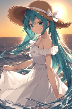1girl, bangs, bare_shoulders, blue_eyes, brown_headwear, closed_mouth, dress, from_side, hat, hat_bow, hat_ribbon, hatsune_miku, long_hair, looking_at_viewer, off_shoulder, ribbon, smile, solo, straw_hat, sun_hat, very_long_hair, water, white_dress, white_ribbon