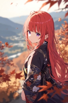 1girl,red hair,purple eyes,furisode,blurry,blurry_foreground,blurry_leaf,landscape,from_above,cowboy_shot,long hair