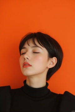 The image features a female subject against a vibrant orange background. She is portrayed with her head tilted back and eyes closed, conveying a sense of peaceful repose. The woman has short black hair, and she is wearing a black turtleneck, creating a striking contrast with the bright background. Her features are depicted with a blend of realism and artistic expression, accentuating her serene expression and the smooth contours of her face and neck. The overall ambiance of the image is tranquil and introspective, highlighted by the use of saturated colors and the clear focus on the subject’s face and upper torso. This creates a captivating visual impact that draws the viewer into a moment of quiet contemplation alongside the subject.